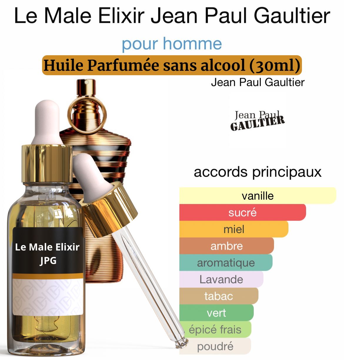 Le Male Elixir est un parfum riche et envoûtante qui réinterprète l’iconique Le Male . La lavande, signature classique, est sublimée par des notes ambrées et une vanille gourmande, reposant sur une base boisée puissante, parfaite pour l’homme charismatique et audacieux.